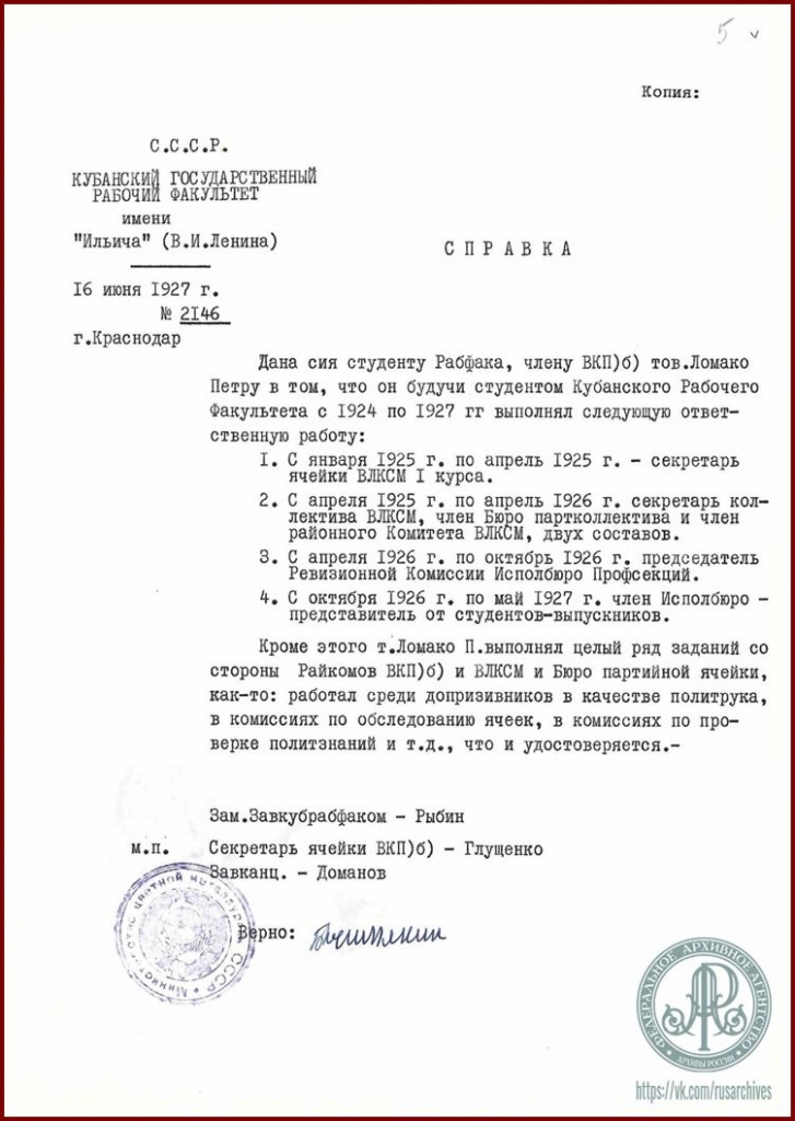 Райпартком возлагает серьезные надежды, что тов. Ломака оправдает выдвижение его на Рабфак и окажется достойным студентом такового».