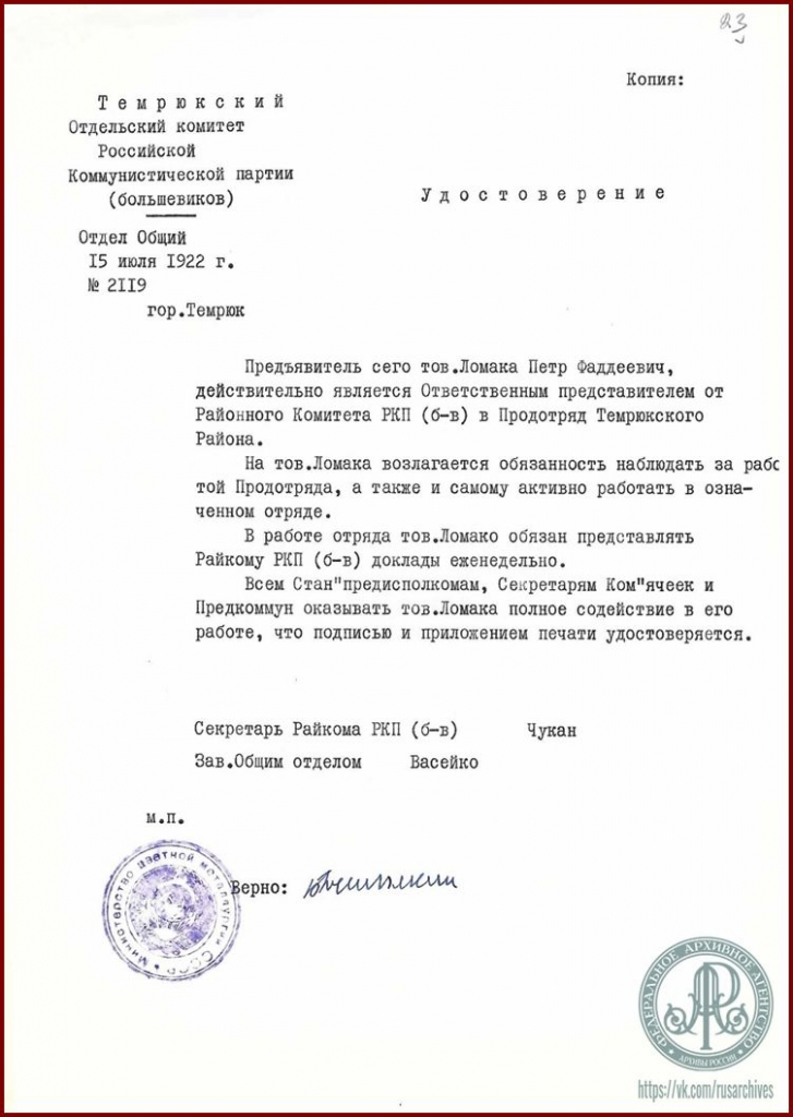 Сохранилась краткая характеристика, данная П.Ф. Ломако Темрюкским райкомом партии в 1924 г.: