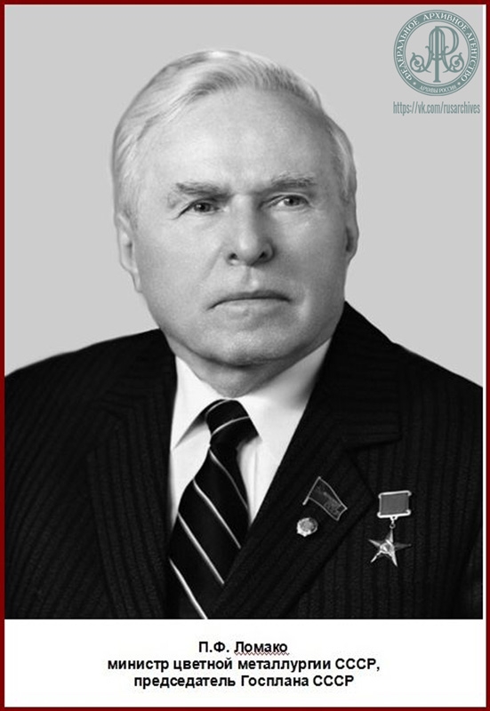 В Российском государственном архиве экономики (РГАЭ) хранится обширный личный фонд П.Ф. Ломако (Ф. 739), в своей основе поступивший в архив еще при его жизни. Неизмеримое количество архивных документов, связанных с его многолетней плодотворной деятельностью, отложилось во многих фондах органов управления советской экономикой, прежде всего – цветной металлургии.